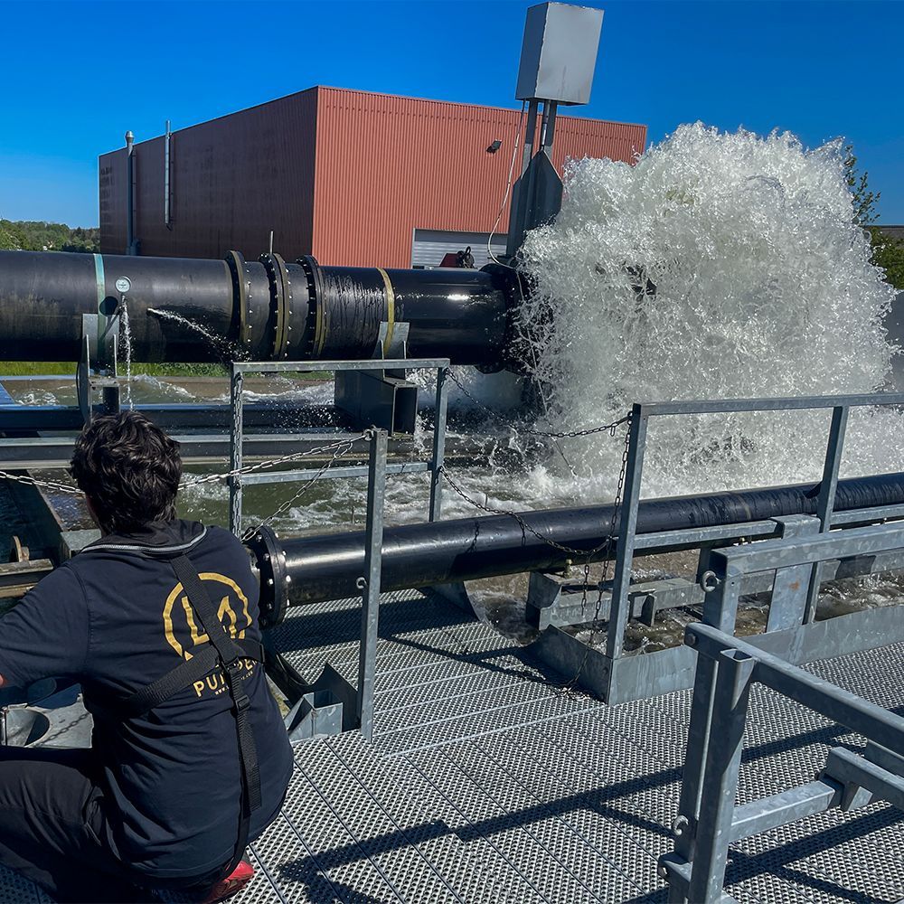 That's a lot of water! And it looks like a large firework show when we pump it straight up into the air at our test plant. Here we investigate energy consumption and the pump's capacity.