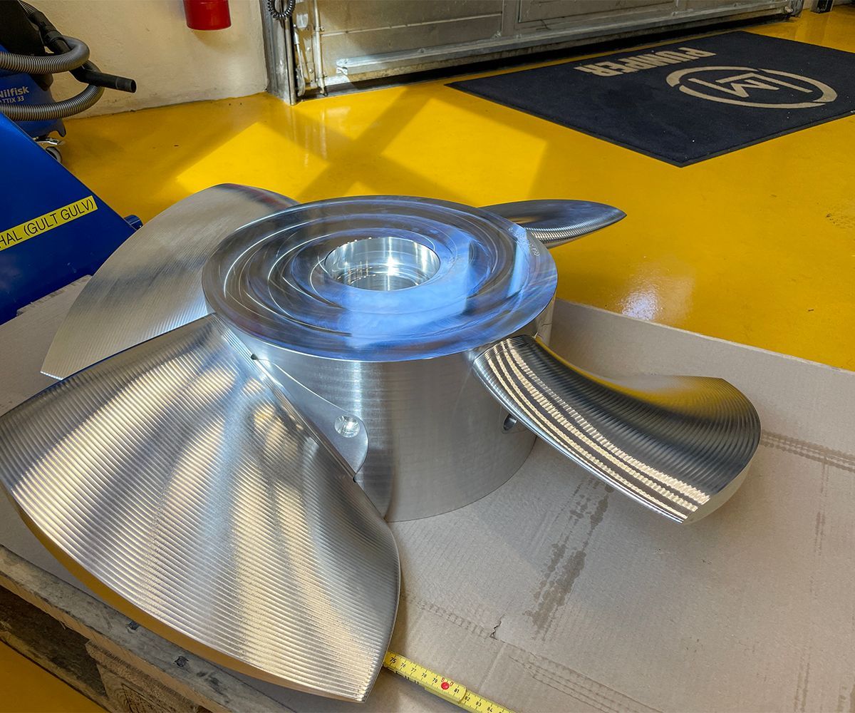 The propeller is approximately 850 mm in diameter and has been milled in five pieces. The four propeller blades were milled separately, as was the hub. They were then assembled into a single propeller. Milling the propeller in multiple pieces optimizes both handling and material usage.